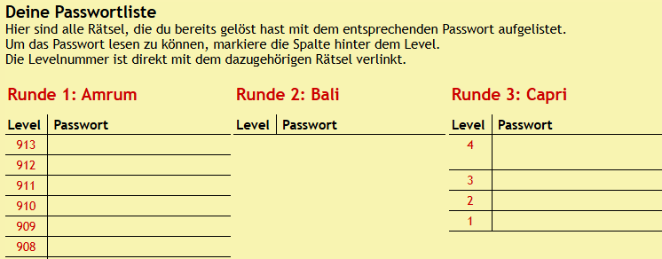 ich habe heute einige Rätsel auf Bali gelöst (330-332). Leider werden die gelösten Rätsel nicht in der Passwortliste und im Highscore angezeigt und wenn ich mich auslogge muss ich immer wieder bei 330 angefangen.